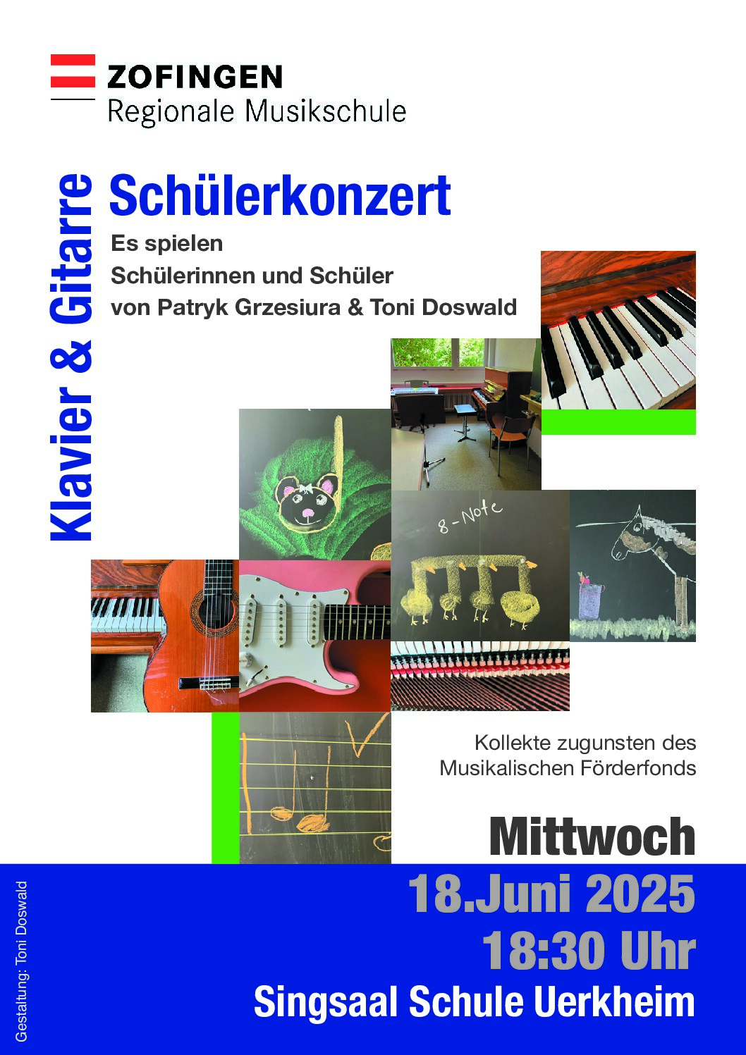 Es spielen Schülerinnen und Schüler von Patryk Grzesiura, Klavier Anton Doswald, Gitarre